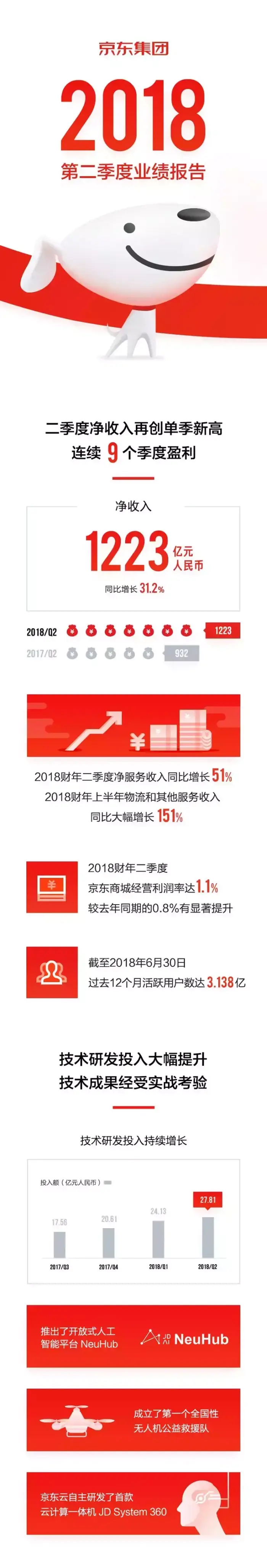 财报显示,2018财年第二季度,京东集团的净收入达到1223亿元人民币(约185亿美元),同比增长31.2%,创下单季净收入的新高;这其中,来自于服务业务的净收入达到了118亿元人民币(约18亿美元),同比增长了51.0%,继续保持高速增长的态势;二季度,用于技术研发上的投入为27.81亿元人民币,较去年同期大幅增长79.8%。