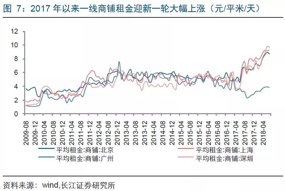 从2009年以来,国内主要一二线城市商铺租金经历过两轮大幅上涨,第一轮是2009年至2012年,第二轮为2017年至今,并且当前北京、上海、深圳等一线城市商铺租金均达到历史高点,二线城市如武汉、长沙、成都、青岛等平均租金开始逐渐超过历史最高水平,且呈现持续提升趋势。