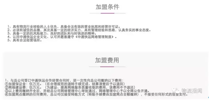 从前文介绍中我们可以看出,中通快运在短时间内实现了网点的广泛覆盖,其中方法就是采用“中心直营+加盟网点”的扁平化管理模式。不过不同于一般加盟制快递的要求,我们在查阅信息时发现以下注意事项: