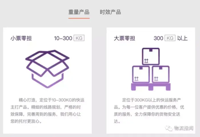 “主营10kg以上产品,重量产品主打10-300kg小票零担,同时提供更优惠价格的300kg以上大票零担服务;时效产品除标准快运外,后续会推出更多核心产品,缩短时效,优化客户体验。除管家式服务、仓配链服务与项目客户专享服务等,冷链运输等服务未来也会推出”。