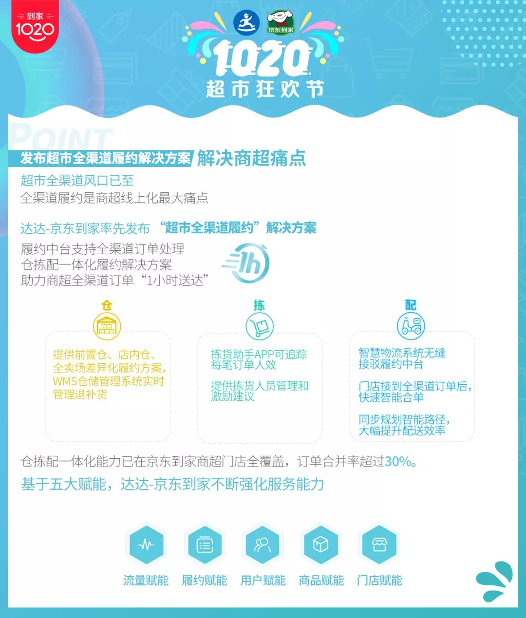 与此同时,达达-京东到家发布超市全渠道履约解决方案,助力商超解决线上化目前的核心痛点——来自多渠道订单的高效履约。达达-京东到家研发的可支持全渠道履约的中台系统已在永旺、华冠等众多商超门店快速推广部署中;能够适应不同模式门店的拣货、配送需求的仓拣配一体化履约解决方案,经验证可大幅提升履约效率,助力商超实现全渠道订单1小时送达。