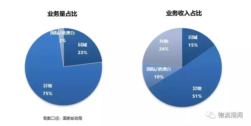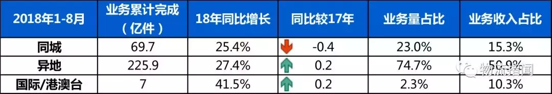 1-8月,同城、异地、国际/港澳台快递业务量分别占全部快递业务量的23%、74.7%和2.3%;业务收入分别占全部快递收入的15.3%、50.9%和10.3%。与去年同期相比,同城快递业务量的比重下降0.4个百分点,异地快递业务量的比重上升0.2个百分点,国际/港澳台业务量的比重上升0.2个百分点。