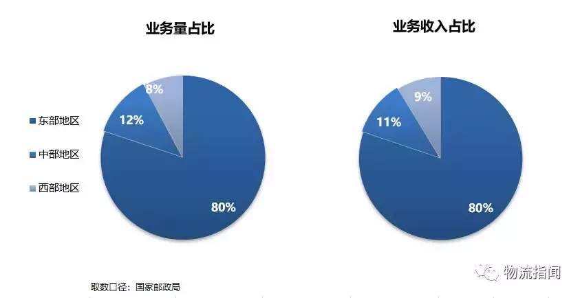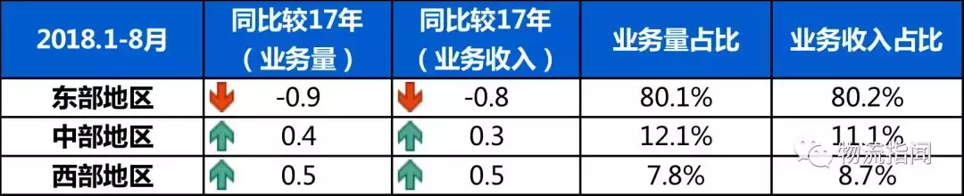 1-8月,东、中、西部地区快递业务量比重分别为80.1%、12.1%和7.8%,业务收入比重分别为80.2%、11.1%和8.7%。与去年同期相比,东部地区快递业务量比重下降了0.9个百分点,快递业务收入比重下降了0.8个百分点;中部地区快递业务量比重上升了0.4个百分点,快递业务收入比重上升了0.3个百分点;西部地区快递业务量比重和快递业务收入比重均上升了0.5个百分点。