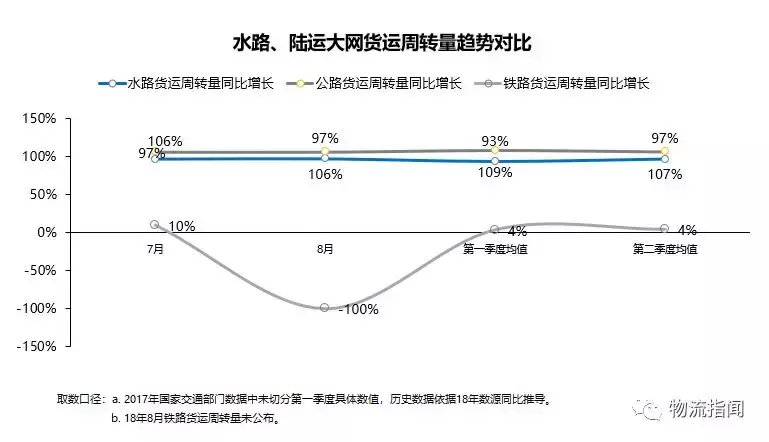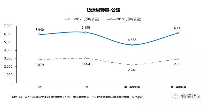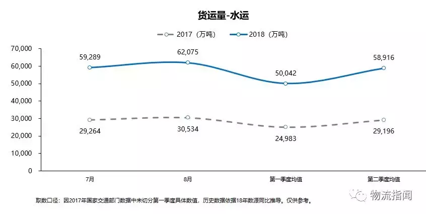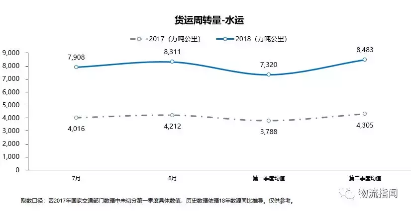 2018年8月,货运量水运与公路运输之和为42亿吨,增速为106.8%,整体态势与第二季度均值基本持平,货运量整体趋于良好。2018年8月,货运周转量水运与公路运输之和为1.5亿吨公里,增速为101.1%,整体态势略高于第二季度均值的1%,货运周转量整体趋于良好,年内旺季即将开启。