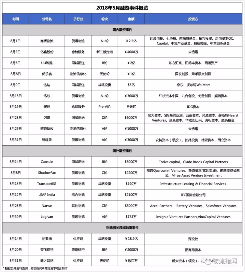 八月,物流及相关行业共发生19起融资事件,其中国内物流行业占到10起,同城配送和货运物流是八月投资的热点。八月国内融资企业中多处于偏早期融资阶段;融资规模均在千万元以上,超过一半达到了亿元级。
