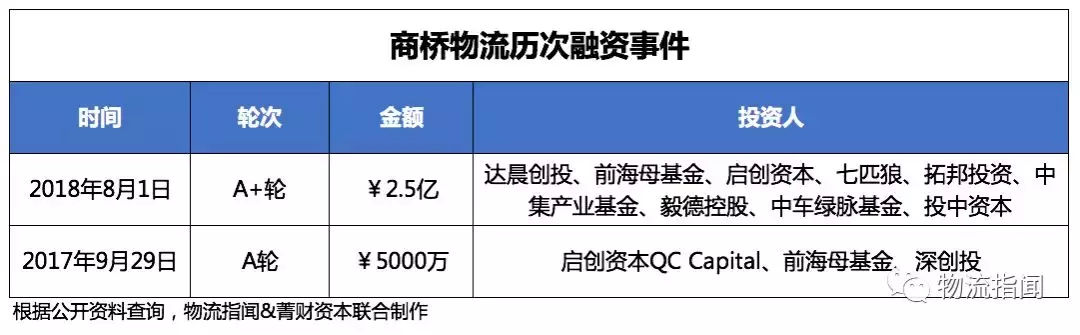 8月1日,商桥物流宣布完成2.5亿元A+轮融资,本次融资由达晨创投领投,中集产业基金、中车绿脉基金、毅德控股、拓邦投资及七匹狼等多家投资机构跟投。本次融资后,商桥物流将加大在人才团队、线下网络、智能算法和大数据系统的资金投入。