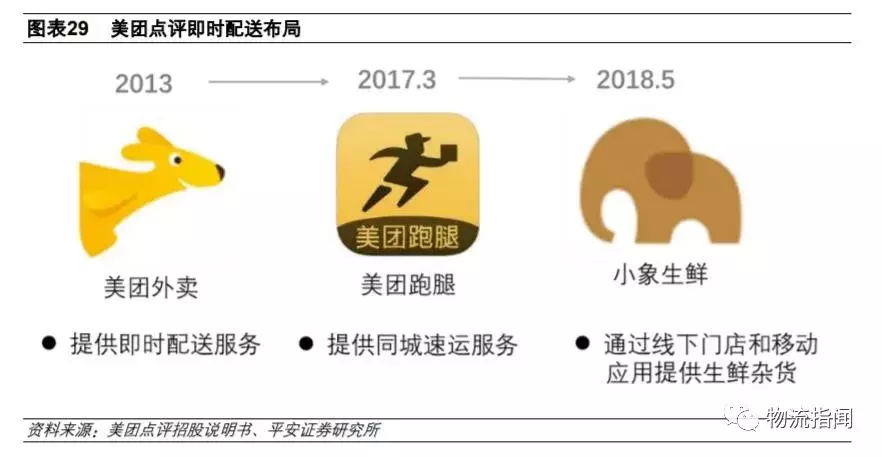 在即时配送领域,美团配送主要进行了以下布局:推出美团外卖,主要提供即时配送服务;推出美团跑腿,打造同城速递服务平台;成立小象生鲜,通过线下门店及移动应用提供生鲜杂货。