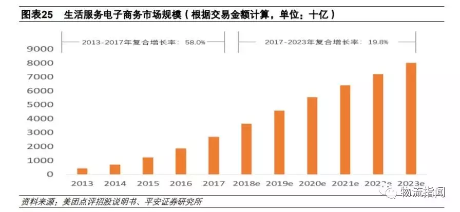 根据美团招股说明书,2017年生活服务电子商务市场规模约为2.7万亿人民币,2023年此市场规模将达到8.0万亿元,年复合增长率达19.8%,市场空间十分广阔。