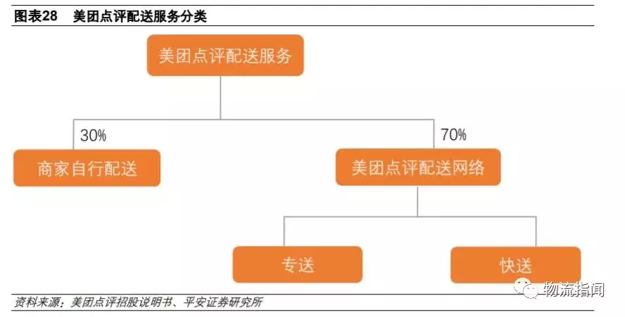 美团点评的商家可以自行配送,也可以委托美团点评提供配送服务。2017年,美团点评超过70%的订单是通过美团点评的配送网络完成的,美团点评通过自有配送网络完成了约29亿单配送。