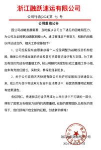 9月13日,融跃速运发布重组公告。公告显示,公司控股股东由原来总裁个人控股调整为战略投资机构控股,确保公司持续发展的资金及各方资源需求提供有力支撑。为了更加有效的完成各项重组工作,经公司研究决定即日成立重组工作小组由朱有克担任组长,吴秋实、林琛担任副组长