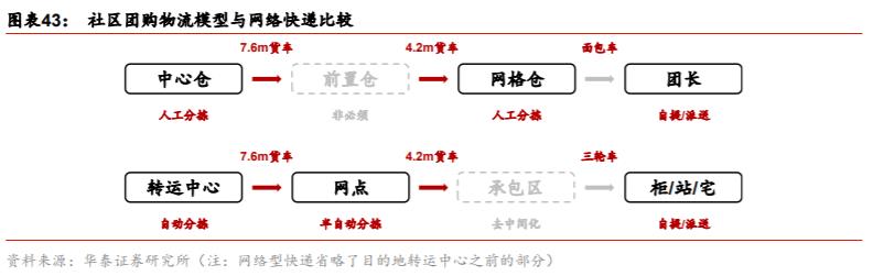 1)社区团购主要采用人工分拣,快递枢纽中心大量使用自动分拣,而网点/承包区通过半自动设备辅助人力。