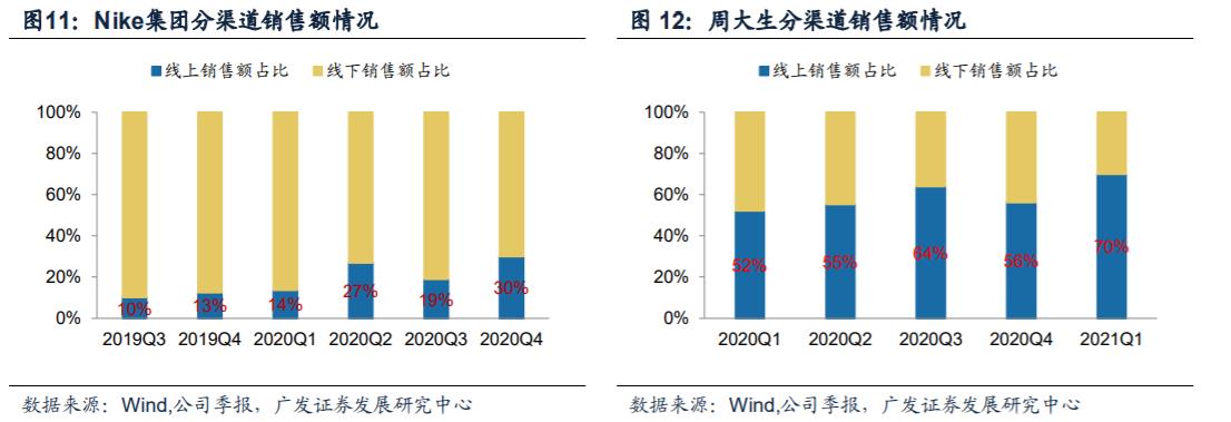 耐克在2020年Q1和Q2季度,线上业务的营收同比增长83%和84%;20Q4季度,首次占其总收入的30%。电商业务比此前公司在2018财年定下的目标(到2023财年,线上业务的销售占比要达到30%,长期的数字化业务将会达50%)提前三年完成。