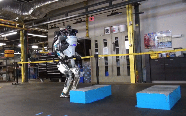 对于一个巨大、沉重的机器人来说,这是一个新的挑战。在完成跑酷跳跃时,它需要靠计算机视觉来识别周围可见的标记物,给自己定位,同时还要控制好重心和动力分配,而且需要不断改变跳跃的方向。