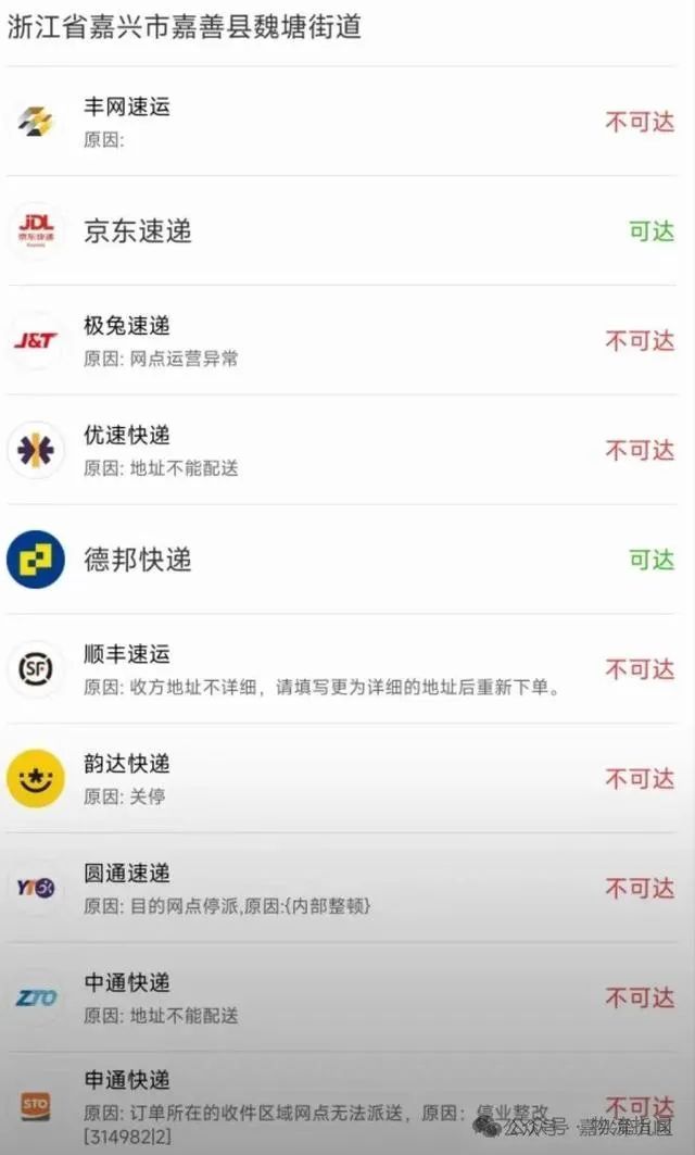 另外,红星新闻也注意到,还有网友曾晒出一张线上下单的截图。图片显示,以嘉善县魏塘街道为到货地址,极兔速递、韵达快递、圆通速递、中通快递、申通快递均显示不可达。其中,极兔速递不可达的原因标注为网点运营异常;韵达快递则显示网点已关停;圆通速递的不可达原因标注为目的网点停派、内部调整;中通快递和申通快递的不可达原因则是地址不能配送,且申通快递还有停业整改的原因。