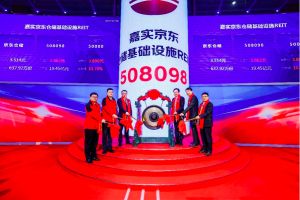 在上市仪式现场,京东集团高级副总裁、京东产发CEO胡伟,京东产发优秀员工代表的廊坊经开项目王忠磊和重庆项目杨春,与嘉实基金董事长赵学军,嘉实基金首席市场官鲁令飞,嘉实基金董事总经理、基础设施投资管理部负责人王艺军共同敲响了上市锣声。