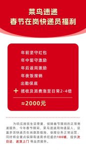 1月18日消息,为保障春节期间的正常寄递服务,今年春节期间,菜鸟速递通过各项激励政策,用待遇留人,确保自营快递网络的正常运营,并在全国百城提供次日达、送货上门等品质服务。据悉,根据测算,春节在岗值守的运输司机、快递员等可享受年夜饭报销,各项福利举措人均额外增收2000元左右。